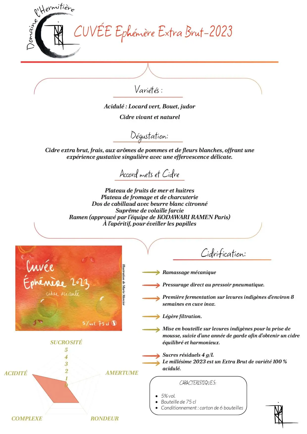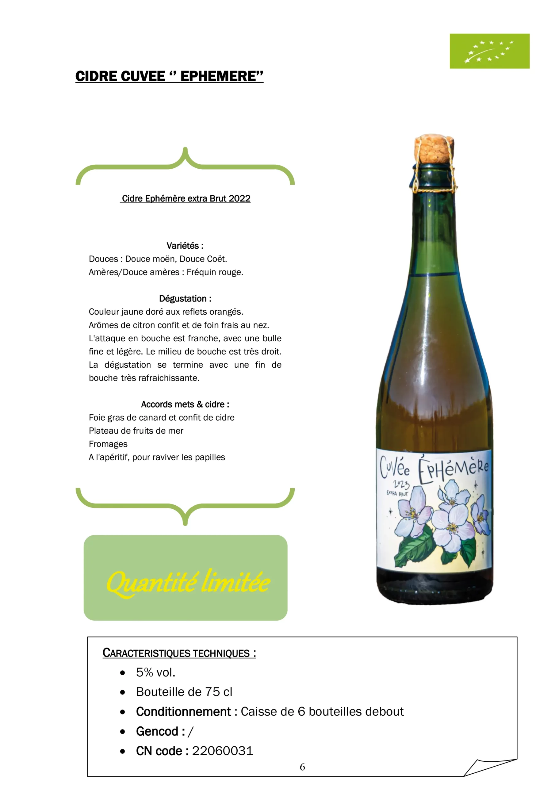 Cidre extra brut, frais, aux arômes de pommes et de fleurs blanches, offrant une