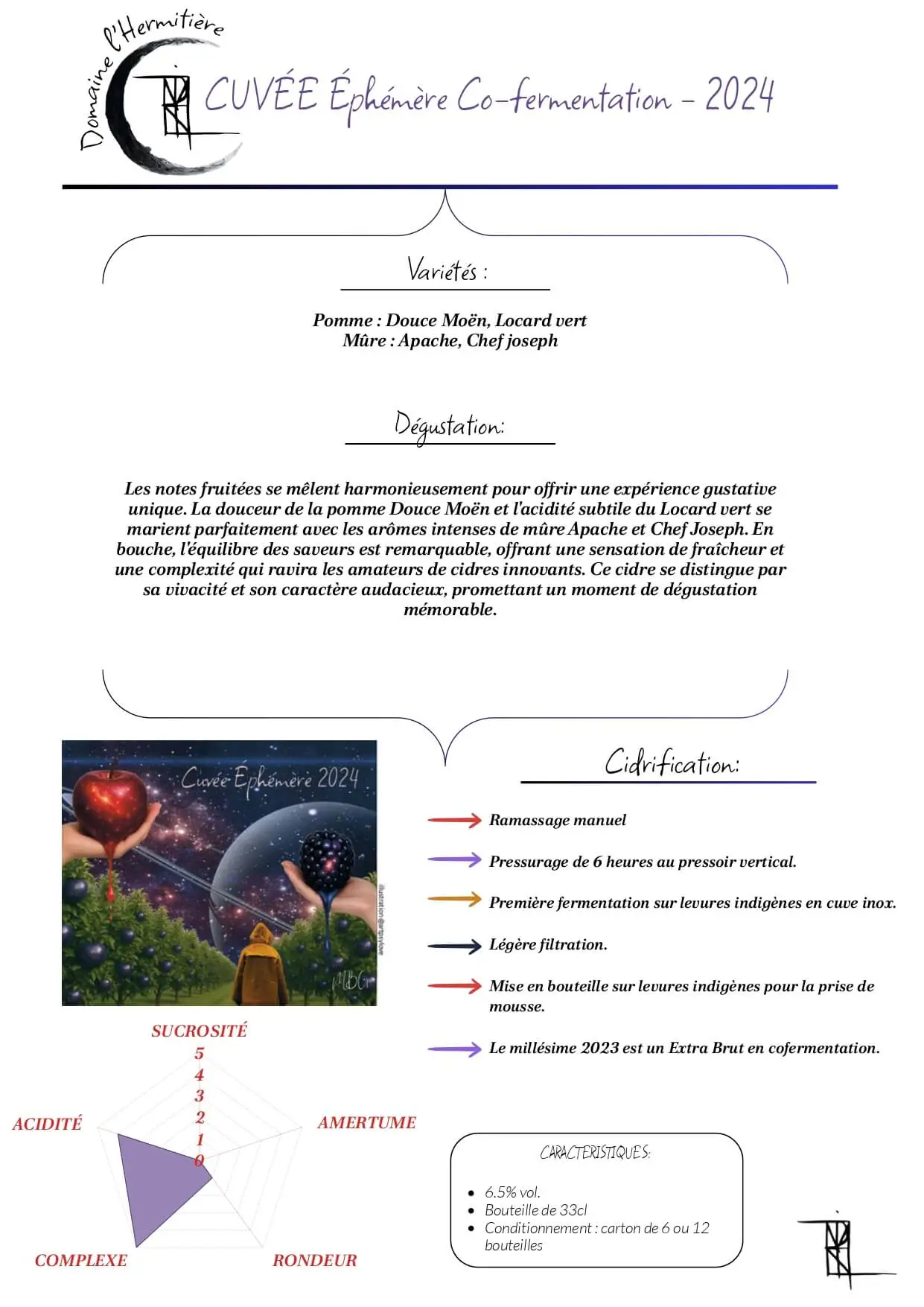 Les notes fruitées se mêlent harmonieusement pour offrir une expérience gustative unique. La douceur de la pomme Douce Moën et l’acidité subtile du Locard vert se marient parfaitement avec les arômes intenses de mûre Apache et Chef Joseph.